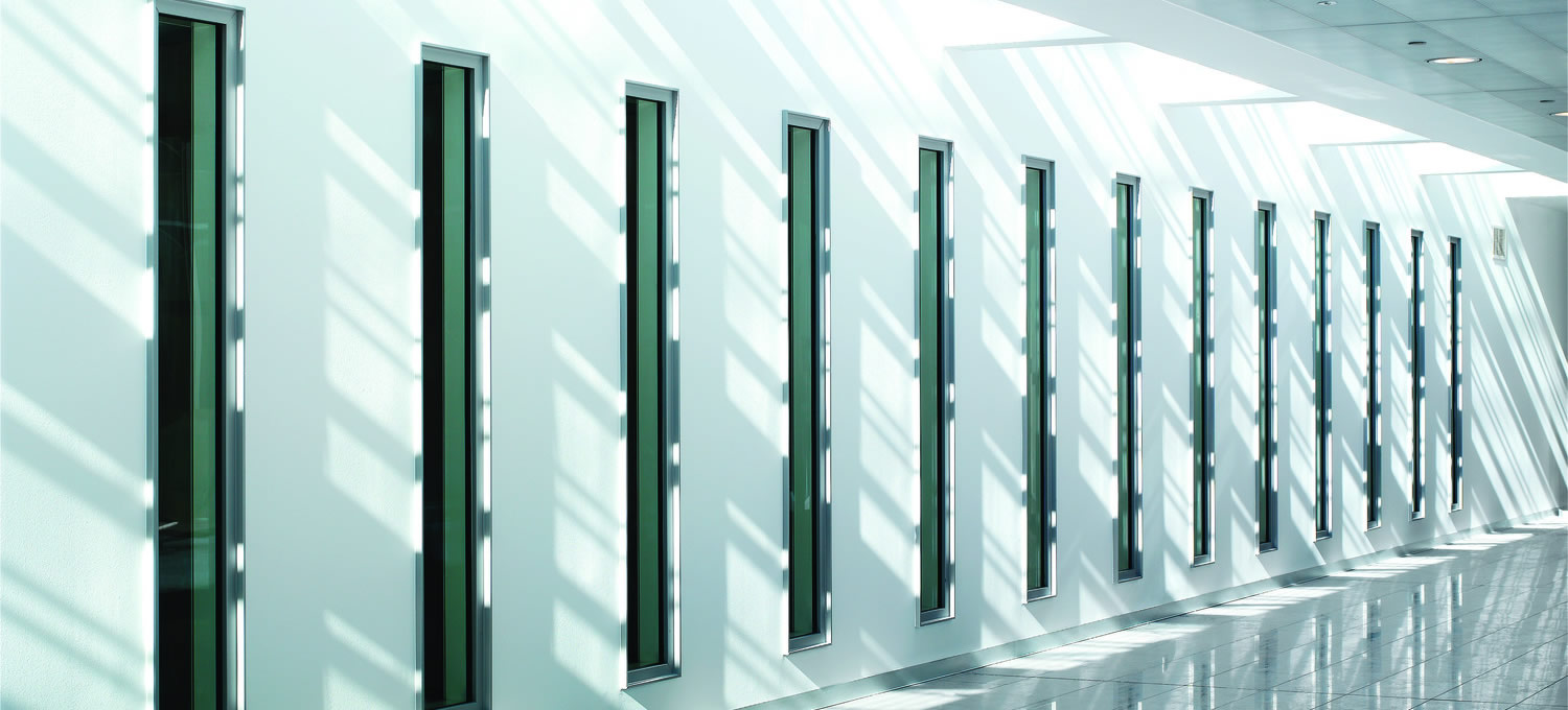 Aluflam’s window frames are constructed from thermally broken narrow aluminum extrusions filled with a proprietary fire blocking material.