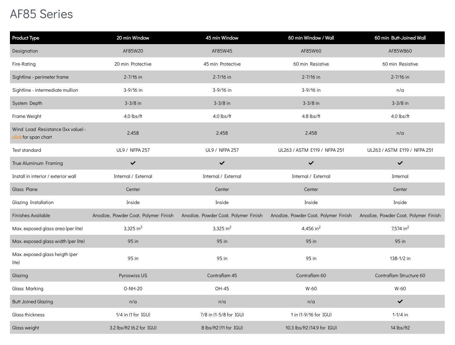 Alum Windows’s frames are constructed from thermally broken narrow aluminum extrusions filled with a proprietary fire blocking material. Window products are available in 20, 45, and 60 minute ratings and Vision Walls are available in a 60 minute rating, both for interior and exterior installation.